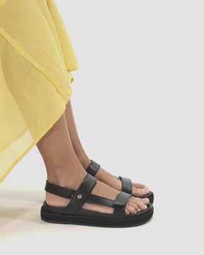 Flat woman's sandals. Black Napa Leather. Velcro Closure. Leather lining. Anatomical insole. Flexible and durable Polyurethane sole. Heel height: 4.5 cm. 100% Made in Spain.