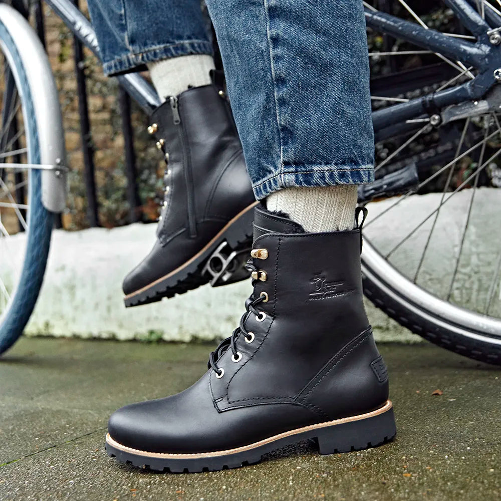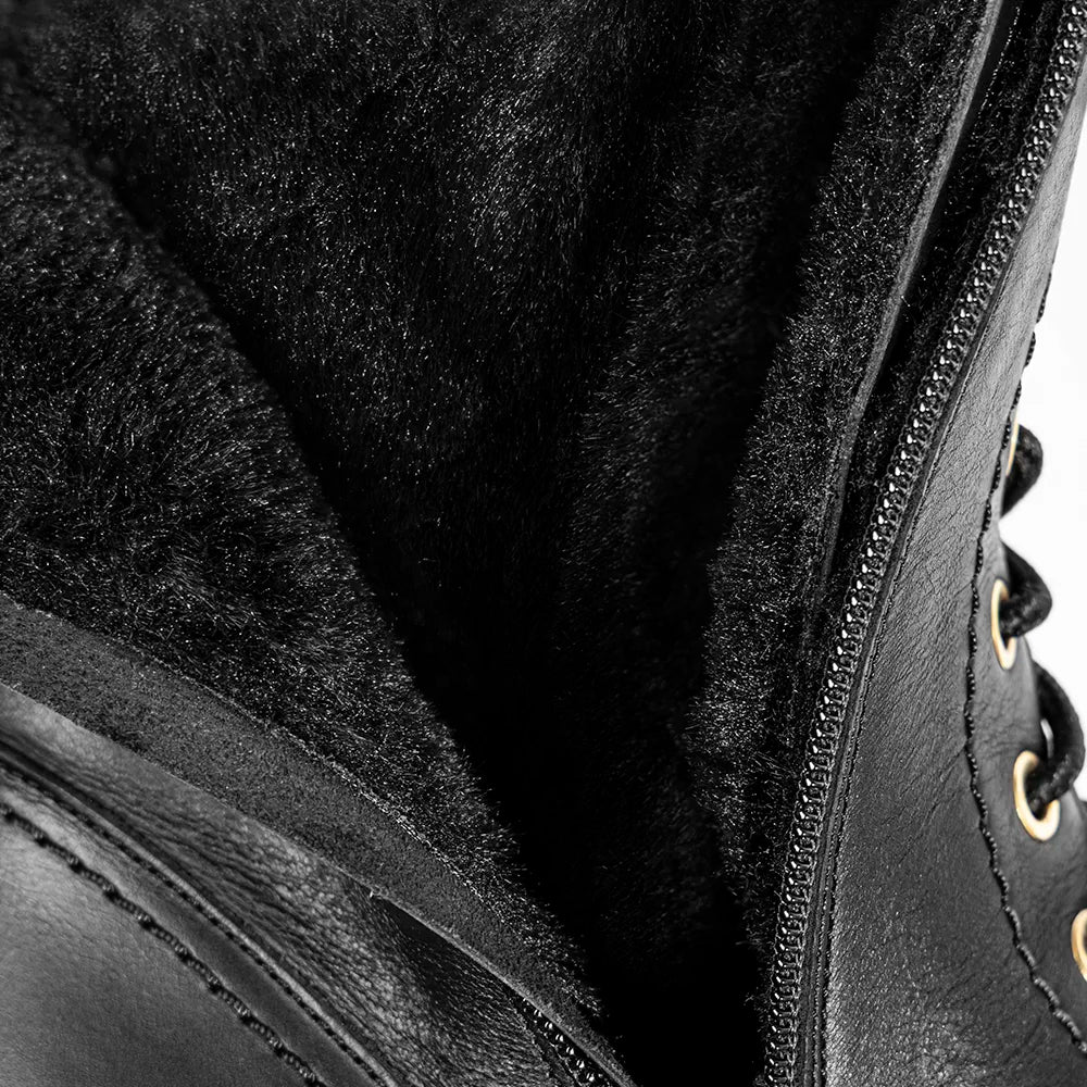 Flat women's Boot. WATERPROOF Black Napa Leather. Lace and zipper closure. Sheepskin lining. Removable anatomical insole. Natural, flexible and durable rubber sole. Shaft height: 16 cm. Heel height: 4 cm. 100% Made in Spain.
