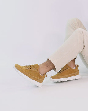 Men's sneakers. Ochre suede. Lace-up Closure. Leather lining. Removable anatomical insole. Lightweight, flexible and strong EVA rubber sole. Heel height: 5 cm. 100% Made in Spain.