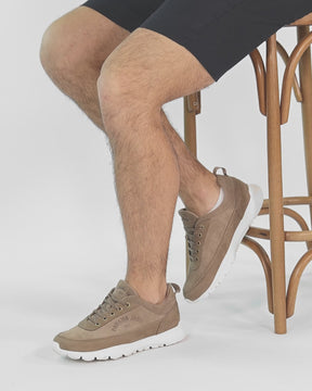Men's sneakers. Taupe suede. Lace-up Closure. Leather lining. Removable anatomical insole. Lightweight, flexible and strong EVA rubber sole. Heel height: 5 cm. 100% Made in Spain.