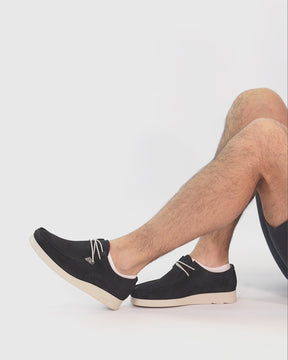 Flat men's Shoe. Navy suede. Lace-up Closure. Leather lining. Removable anatomical insole. Flexible and durable Polyurethane sole. Shaft height: 7 cm. Heel height: 4.3 cm. 100% Made in Spain.