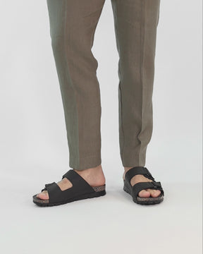 Men's sandals. Black nappa grass leather. Velcro Closure. Leather lining. Anatomical insole. Flexible and durable cork and Polyurethane sole. Heel height: 3 cm. 100% Made in Spain.